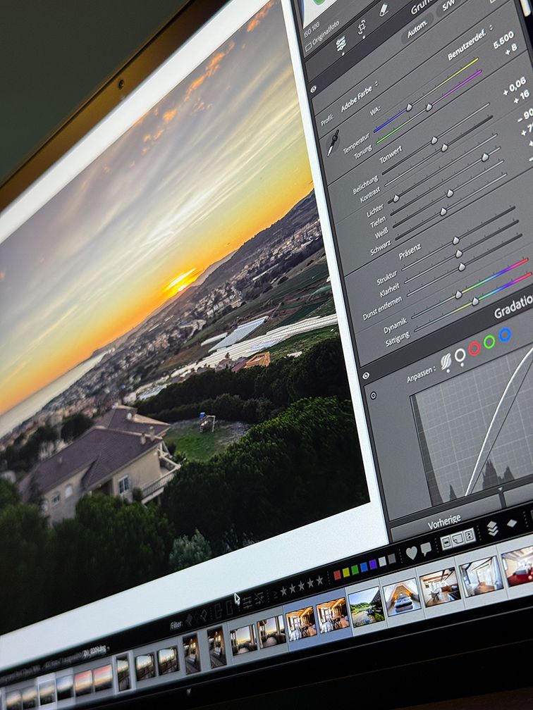 Professional real estate images are created through reliable equipment and precise editing. We work with mirrorless full frame cameras, high quality wide angle lenses, a stable tripod, and professional lighting equipment. Grid overlays and leveling tools help ensure exact alignment.